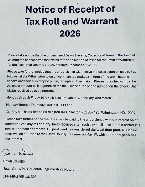 Notice of Receipt of Tax Roll and Warrant for the Town of Wilmington 2026